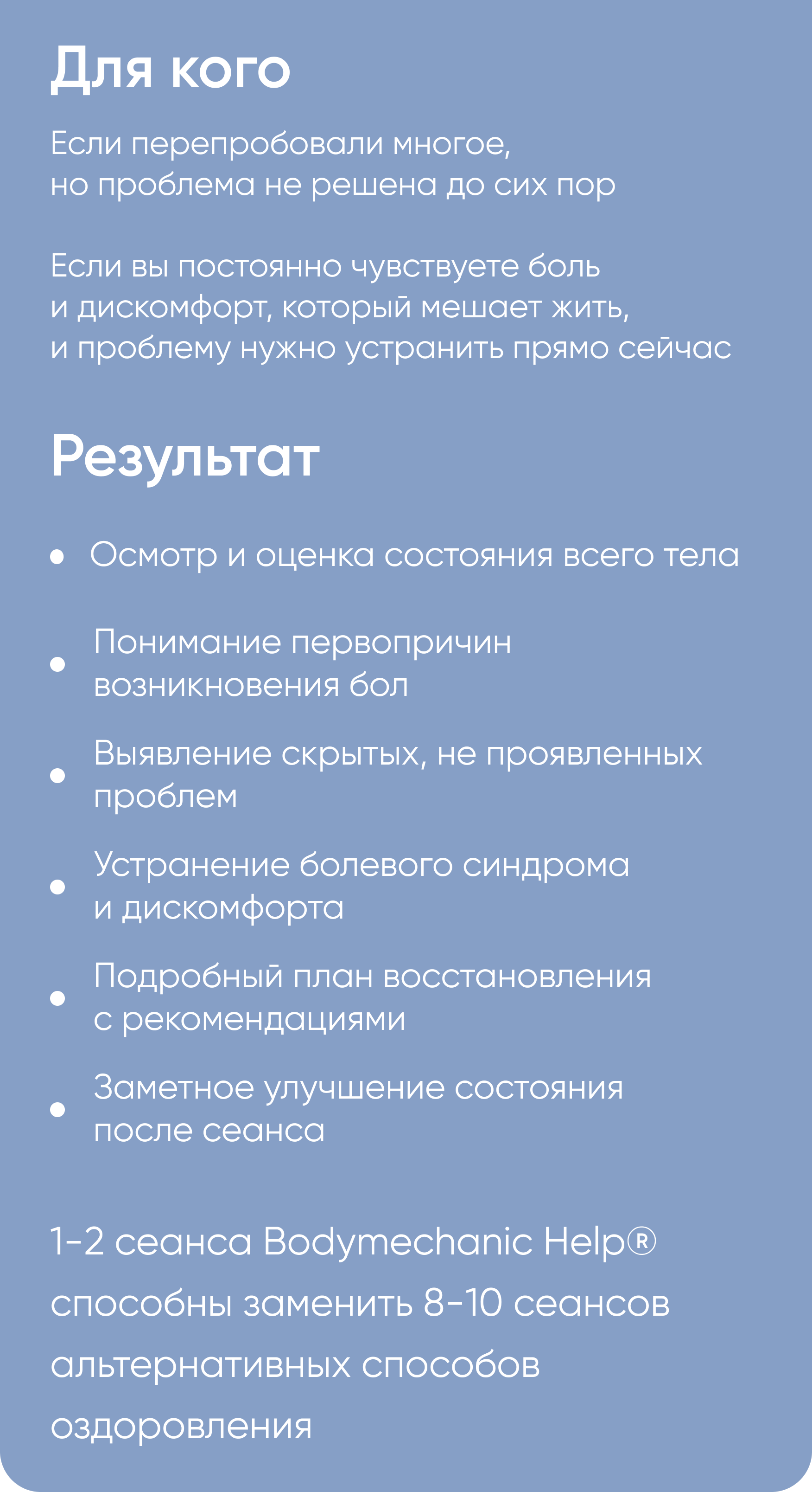 1-2 сеанса Bodymechanic Help® способны заменить 8-10 сеансов альтернативных способов оздоровления